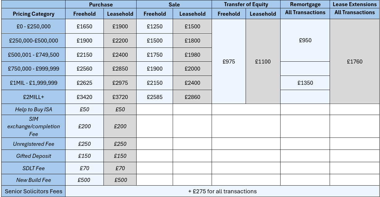 Please see below our table of prices for residential conveyancing, updated from February 2026.
